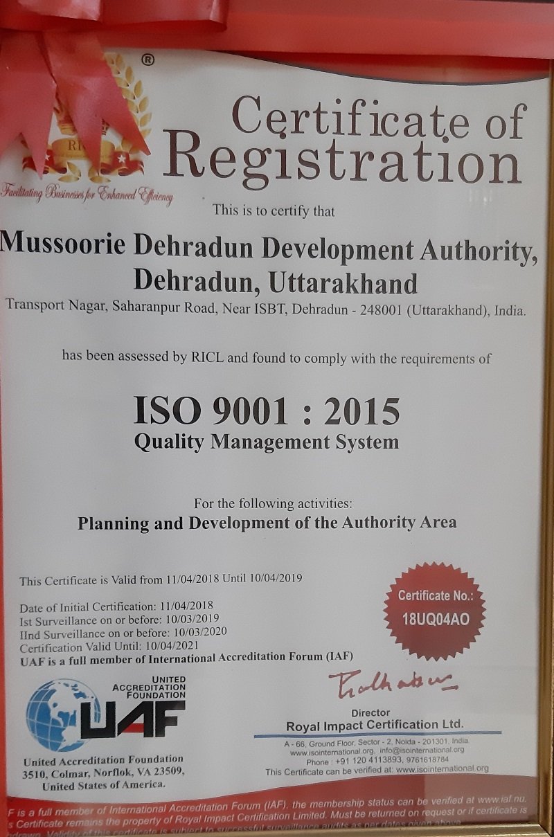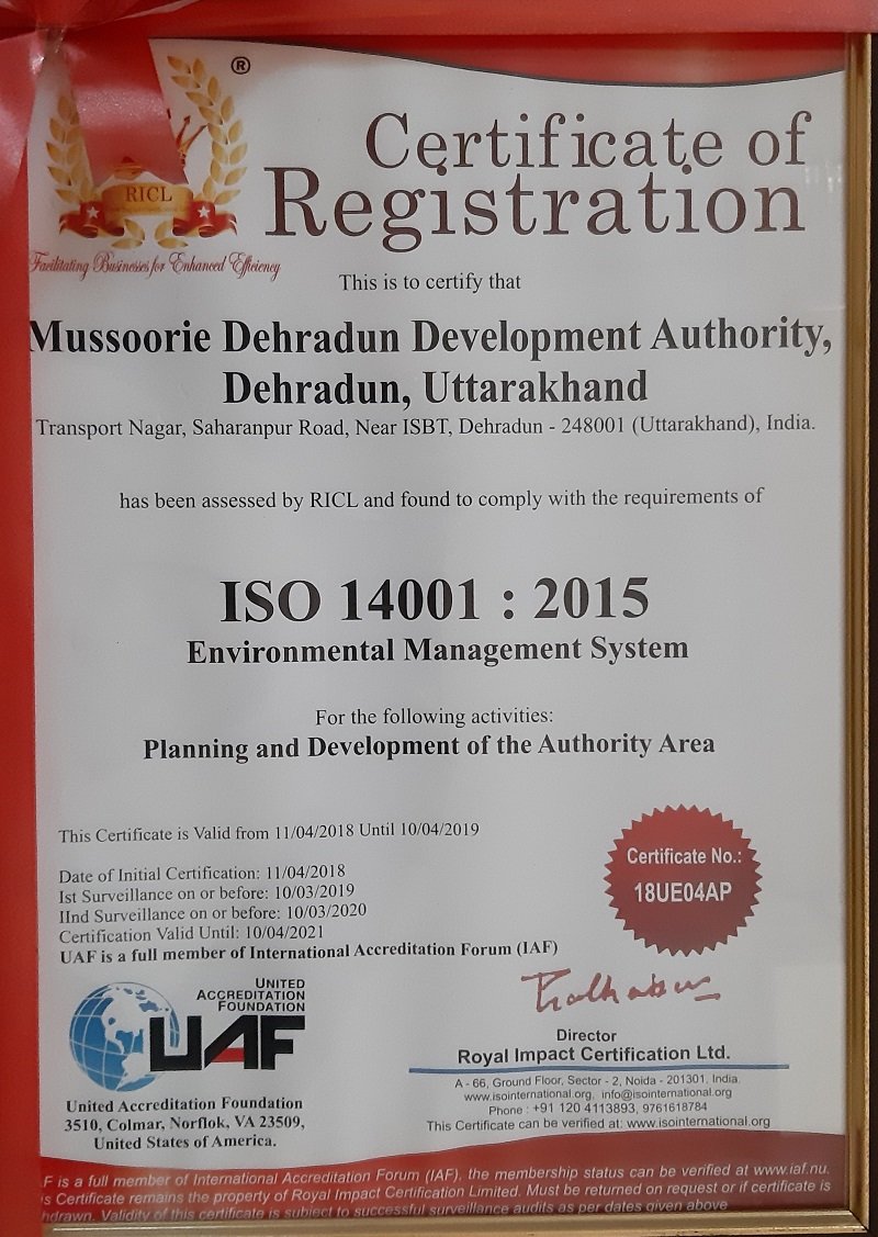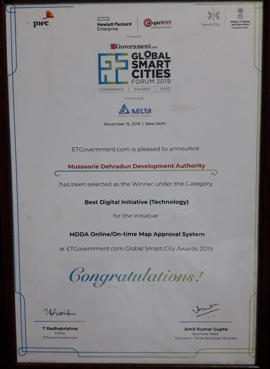 Mussoorie Dehradun Development Authority was awarded “Excellence in best implementation of Pradhan Mantri Awaas Yojana ” for the best implementation of Pradhan Mantri Awaas Yojna in the whole of India during a grand ceremony in “Municipalika 2018” which was organized from 19th to 21st September at Bombay Exhibition Center, Mumbai.